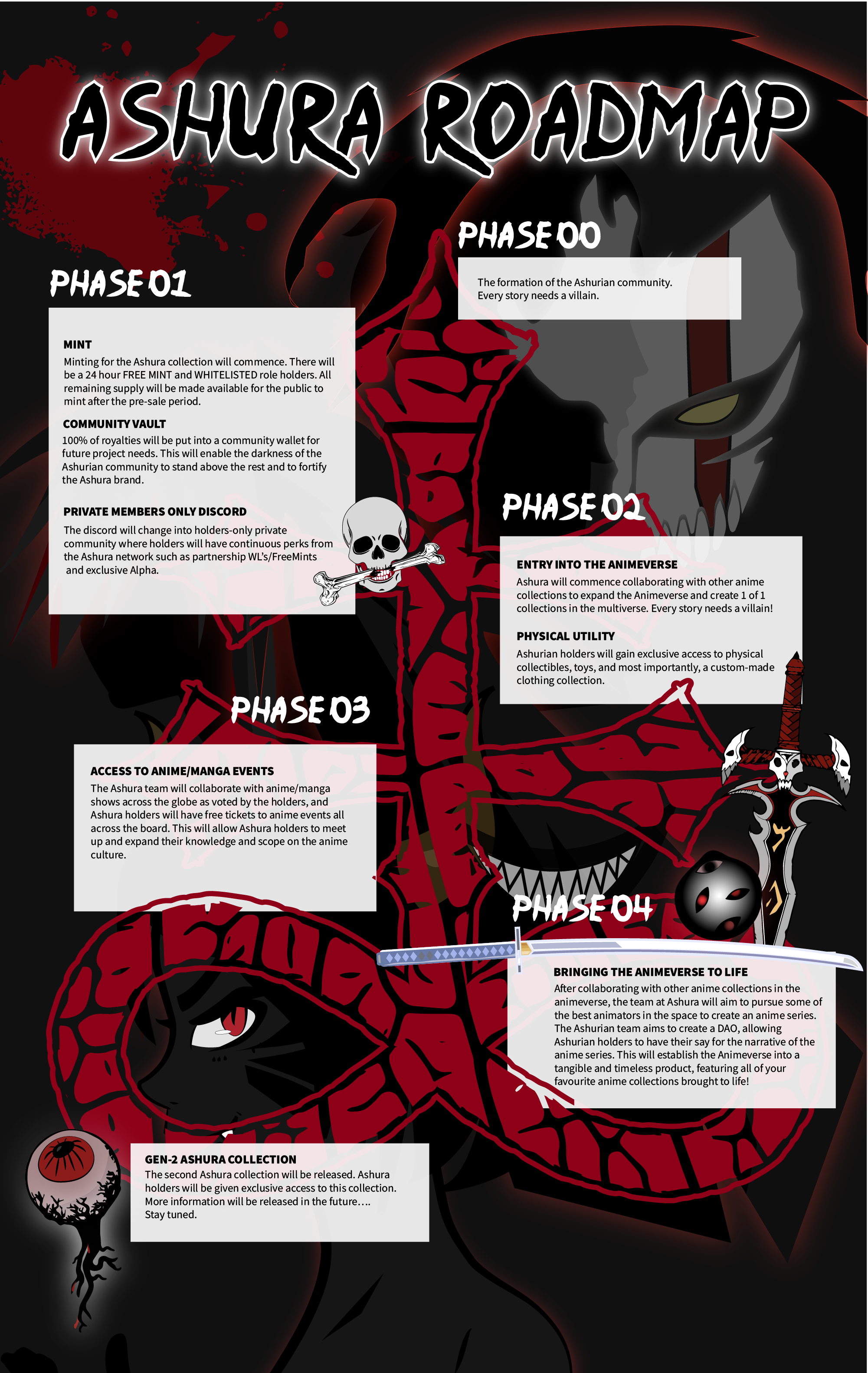 Here is the official Ashura roadmap. Our vision is to create a community where its members control the narrative. The Ashurians will rise to the top of the world and create a brand which includes physical and digital utility. We aim to create a lasting brand that lives on forever in the Ashuraverse. This dark journey begins as soon as minting commences…..